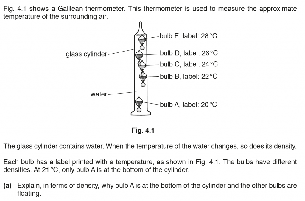a. As temperature increases, volume increases and density decreases. If the density is lower the object will float. Bulb A is at lower temperature so lesser volume and higher density, so it at the bottom of the cylinder and others at higher temperatures and lower densities float.