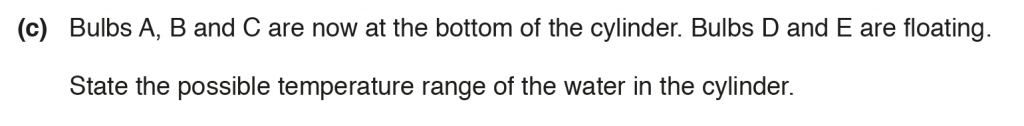 c. Bulb at 240C is denser than water, which is why it sinks; thus, water will have a lower limit of 24oC, and bulb D at 26oC floats, thus water will have a upper limit of 26oC.