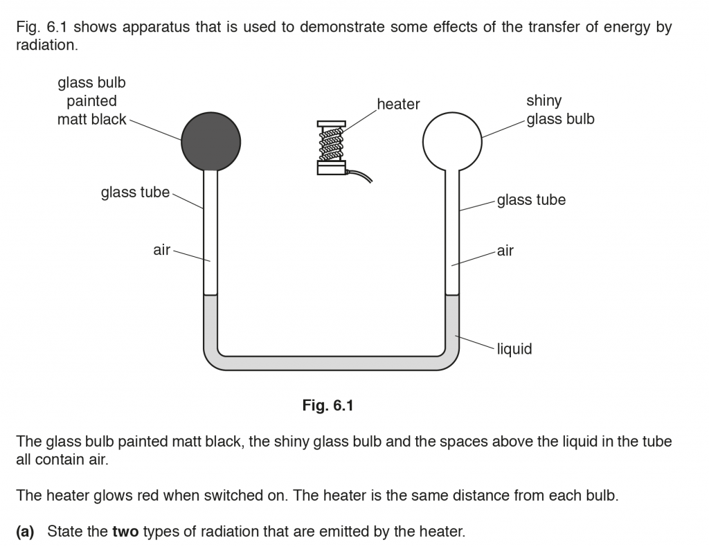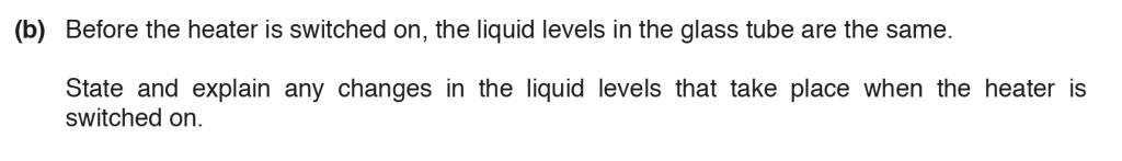 b. When the heater is switched on the glass bulb painted black absorbs more radiation than the shiny glass bulb, heating up the air column below it more, thus increasing its volume, and pushing the liquid column more. The liquid level on the left column decreases and on the right column increases.