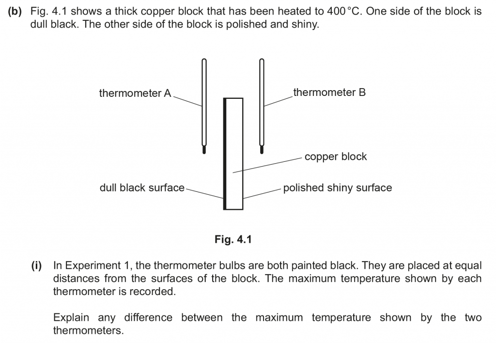 b. i. The maximum temperature shown by thermometer A is higher than that of thermometer B. This is because it is closer to the dull black surface which emits radiation at a faster rate.