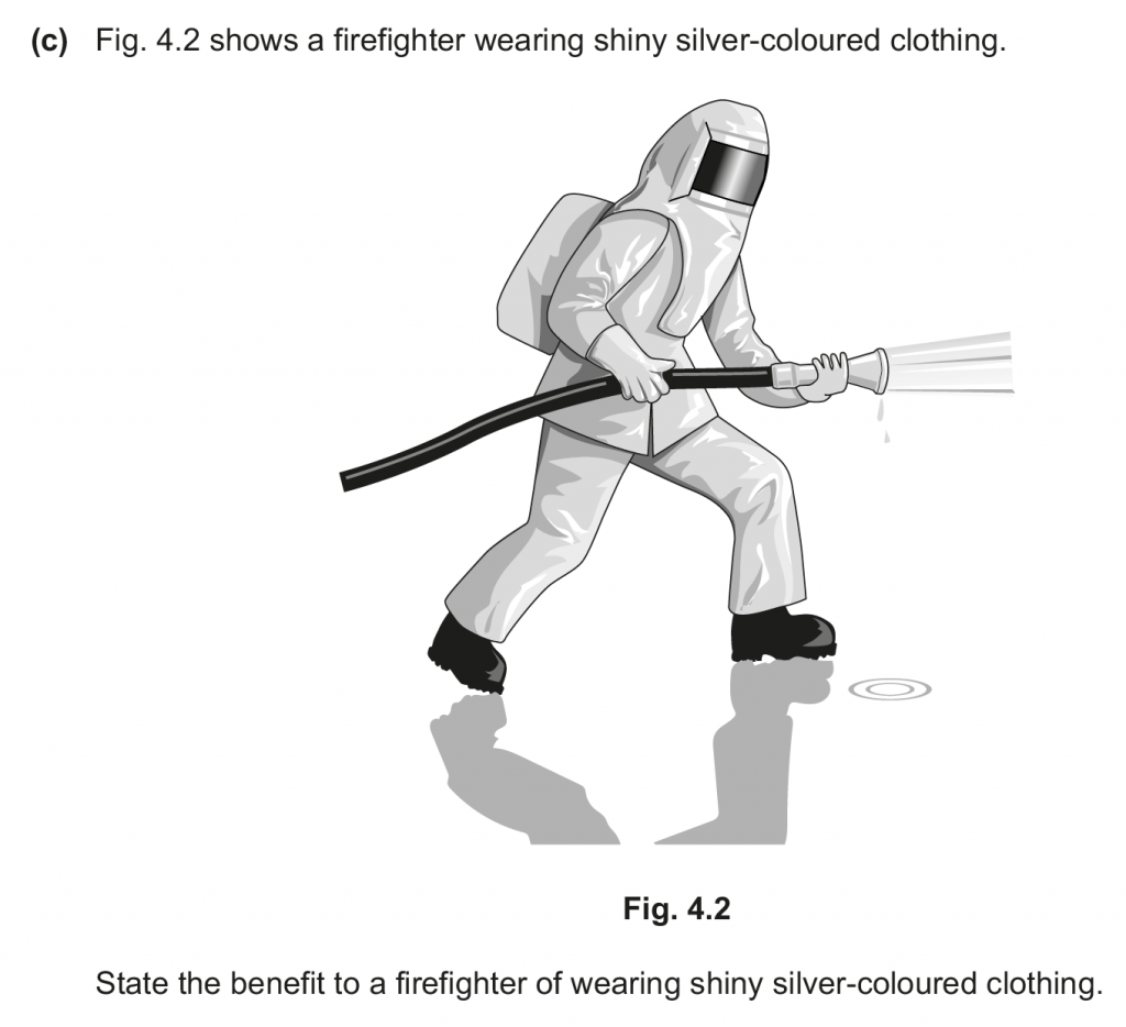 c. The shiny silver-coloured clothing will reflect more and absorb lesser, thus the firefighter would be able to tolerate higher external temperatures.