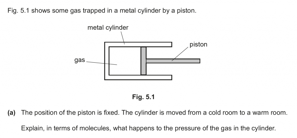 a. The molecules of gas would be at a higher average kinetic energy in the warm room, and thus would strike the walls of the cylinder at higher momenta and more frequently, thus increasing the pressure exerted.