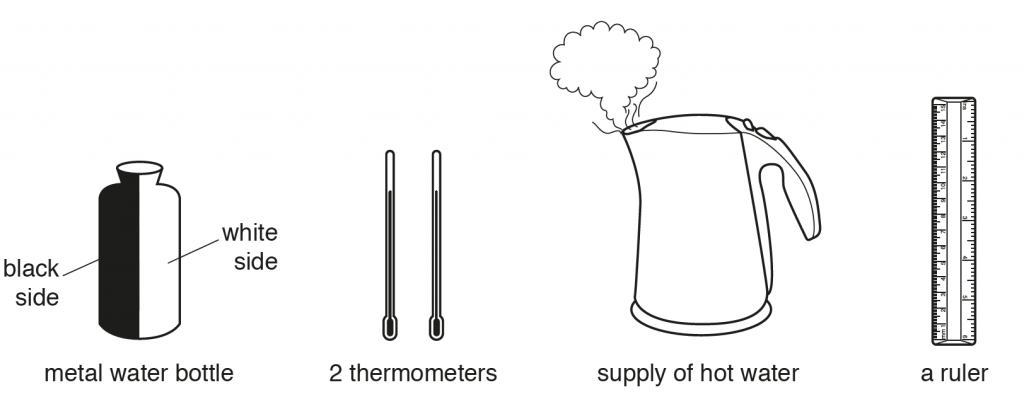 b. First put hot water in bottle and place thermometers to measure temperatures on each side of the centre of the bottle. Then place thermometers near the bottle, equidistant from the bottle, and record temperatures regularly. We expect to find the thermometer near the black side to have a higher reading or to rise faster or to have a larger temperature difference.