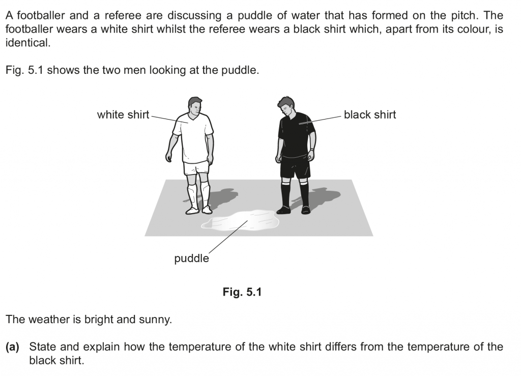 a. White shirt is a poor absorber than black coloured shirt, so it heats up lesser. The temperature of the white shirt is thus lesser than that of the black shirt.