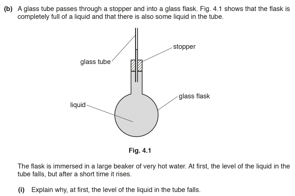 b. i. This is because the glass expands more than the liquid for the same temperature rise. The glass is a poor conductor of heat thus the liquid takes time to heat up and expand. Thus, the level of liquid in the tube drops.