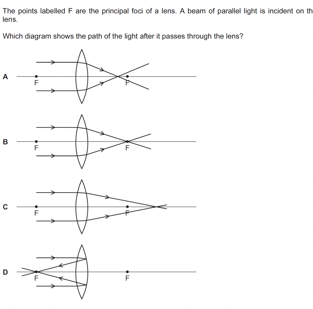 Rays parallel to the principal axis on passing through a converging lens, like above, pass through the focus.