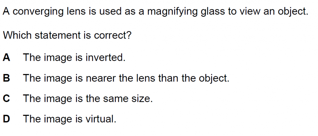 The image produced by a converging lens when used as a magnifying glass is produced on the same side as the object and is virtual.