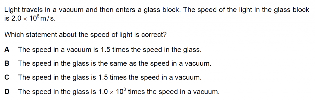 Speed of light in vacuum is 3 x 108 m/s, which is 1.5 x 2.0 x 108 m/s = 3.0 x 108 m/s.