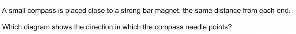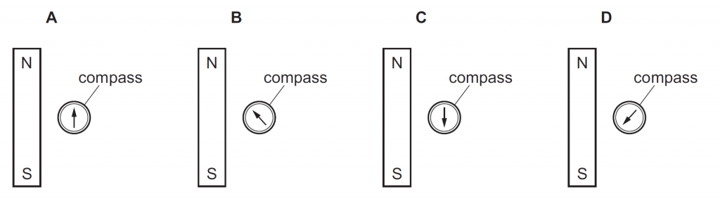 The compass needle will point in the direction of the magnetic field line, which is away from the N pole of the compass and toward the S pole of the compass. So,
