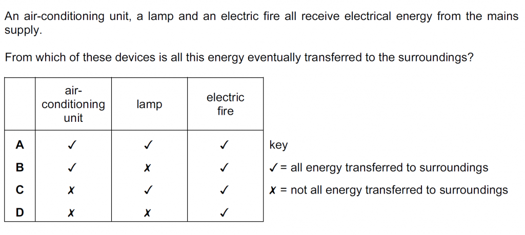 The air-conditioning unit will absorb energy from the surroundings. The lamp and the electric fire will transfer all energy to the surroundings.