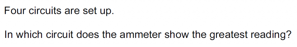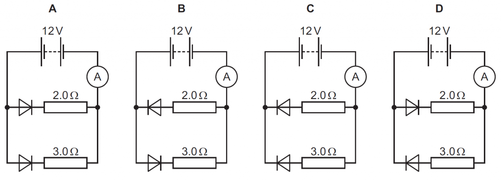 In Circuit A, both the diodes are forward biased so allow a large current to flow through them, thus the ammeter in A will show the greatest reading.