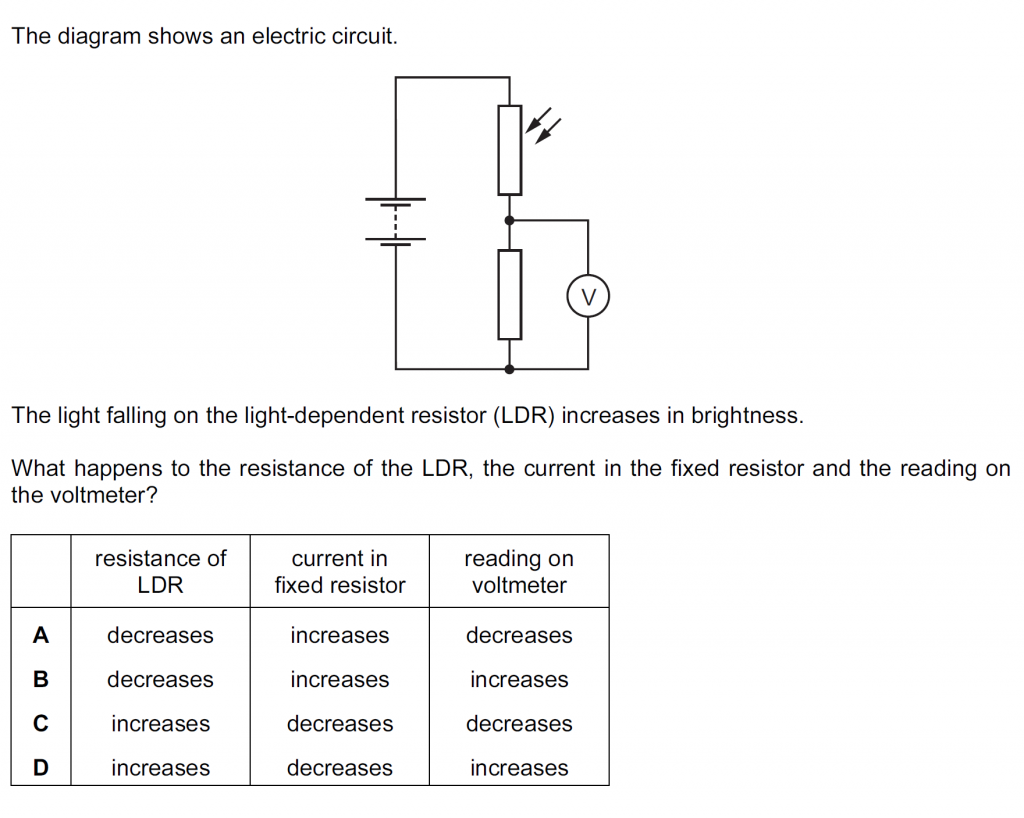 The increased brighter incident light will decrease the resistance of the LDR, increase the current in the fixed resistor as the total resistance then decreases, and that also increases the reading on the voltmeter.