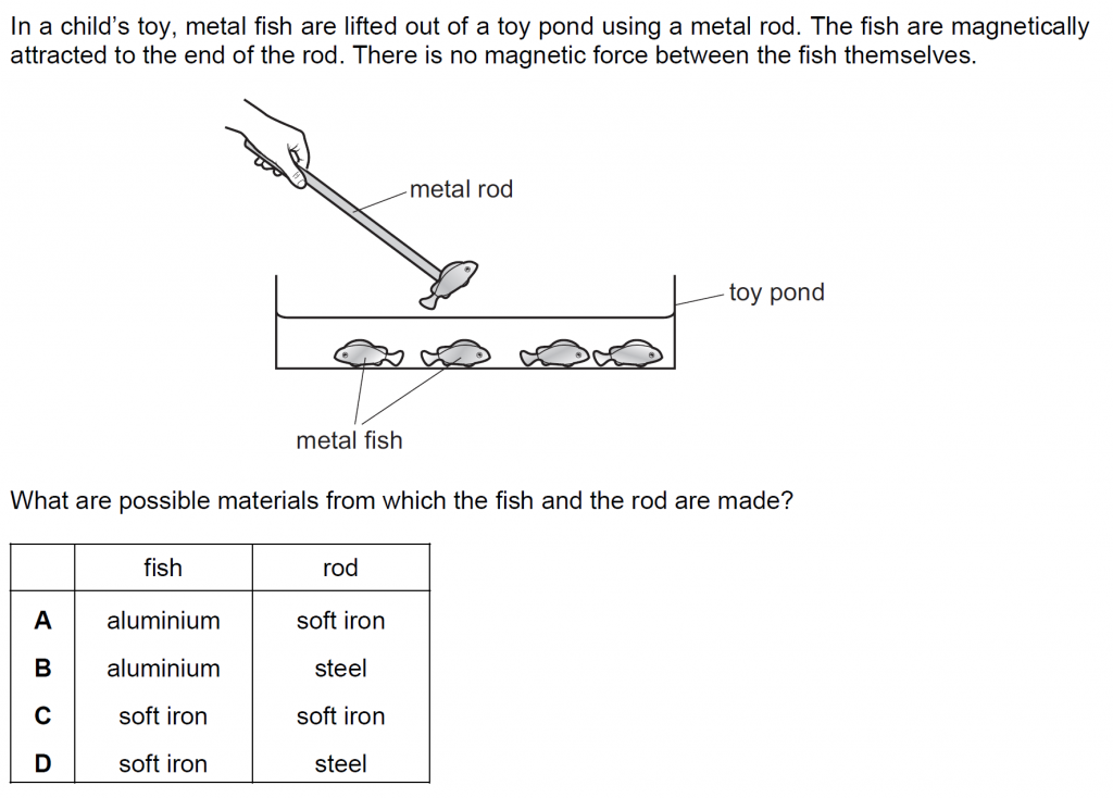 The metal rod is a permanent magnet, so made up of steel. The fish gets magnetised easily, so made up of soft iron.