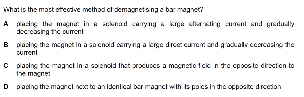 Method A, as the large alternating current will keep switching the magnetic field in opposite directions, rapidly, and thus be most effective in demagnetising the bar magnet.