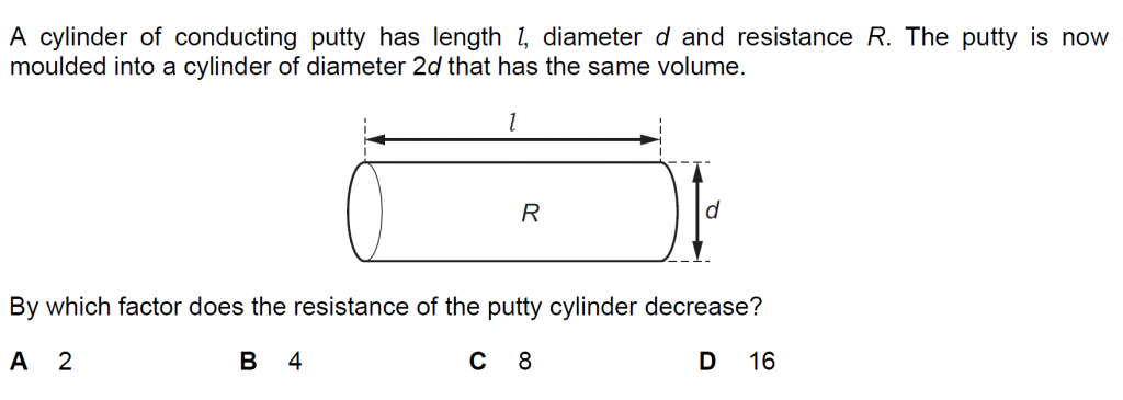 Thus, the resistance depends directly on the length and inversely on Area, so, it is now, l’/ A’ = l/ (16A), or R/ 16. Thus, decrease by a factor of 16.