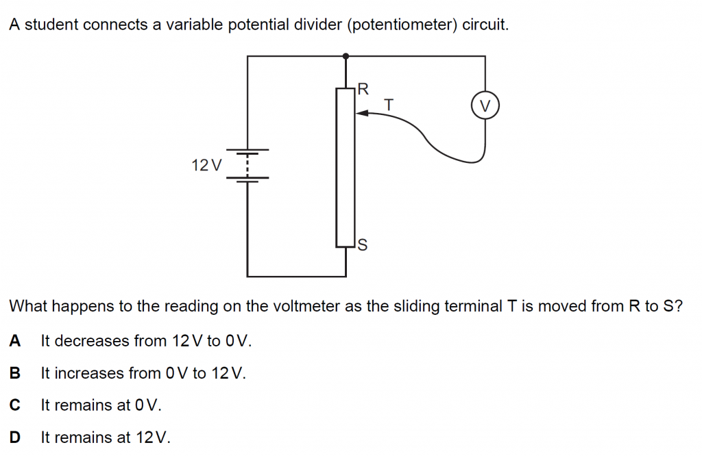 It increases from 0 to 12 V. As the potential difference across an electrical device is proportional to its resistance, which changes from 0 to maximum as the sliding terminal is moved from R to S.