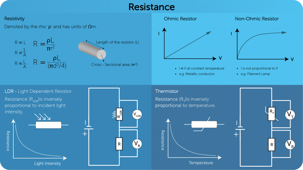 - Resistance is the ratio of potential difference across an appliance to the electric current flowing through it.