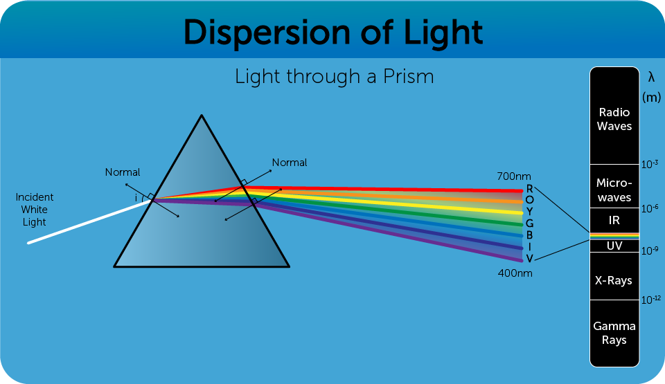 Splitting of a white ray of light into its constituent colors is called dispersion of light. It occurs in glass prism or in water bubbles. Speed of all the colors are same in air or in vacuum but when it refracts in a medium like water/glass, all colours travel with different speeds so their refractive index is different in the prism, and it refracts at different angles.